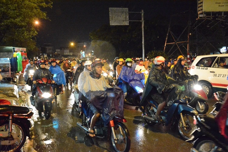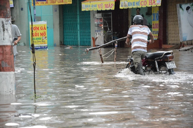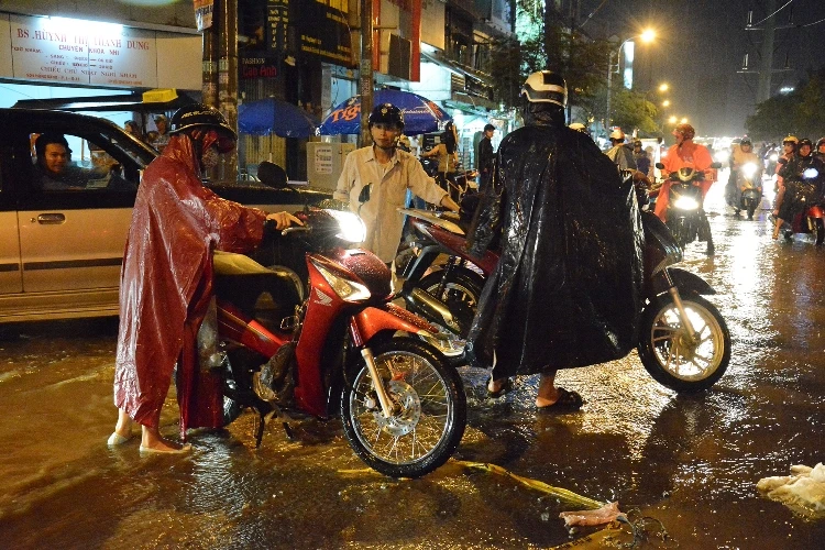 Tương tự nước ngập sâu tràn vào nhà người dân trên đường Lũy Bán Bích (Tân Phú). Do nước ngập sâu nên hàng trăm xe gắn máy khi lưu thông qua các tuyến đường này bị tắt máy phải dẫn bộ.