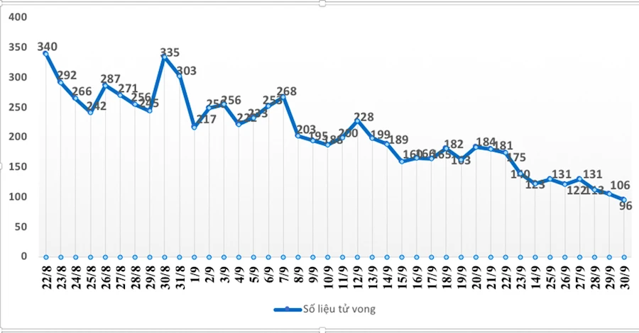 Đặc biệt, một tin vui là chỉ có 96 bệnh nhân COVID-19 tử vong trong ngày 30-9 so với ba ngày trước lần lượt là 131, 113, 106 (tổng số tử vong cộng dồn từ đầu tháng 1-2021 đến nay là 14.946 người).