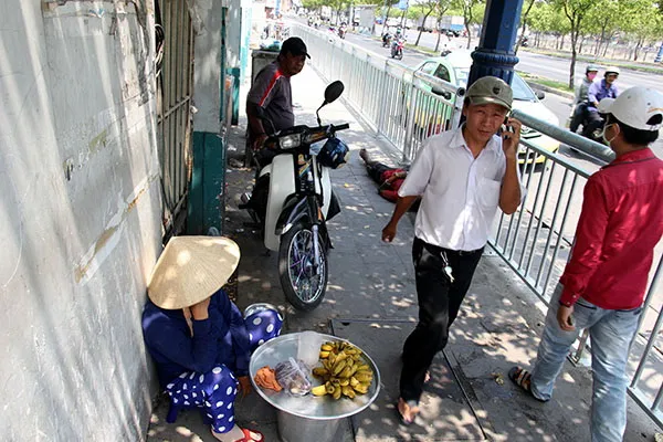 Người bán hàng rong vẫn tranh thủ bán trên vỉa hè vì không biết đi đâu. Ảnh: HOÀNG GIANG