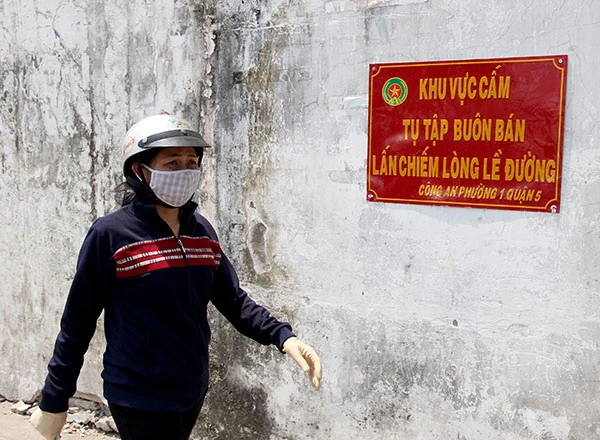 Biển cấm tụ tập buôn bán lấn chiếm lòng lề đường được công an phường 1, quận 5 gắn dọc bên lối đi bộ. Ảnh: HOÀNG GIANG