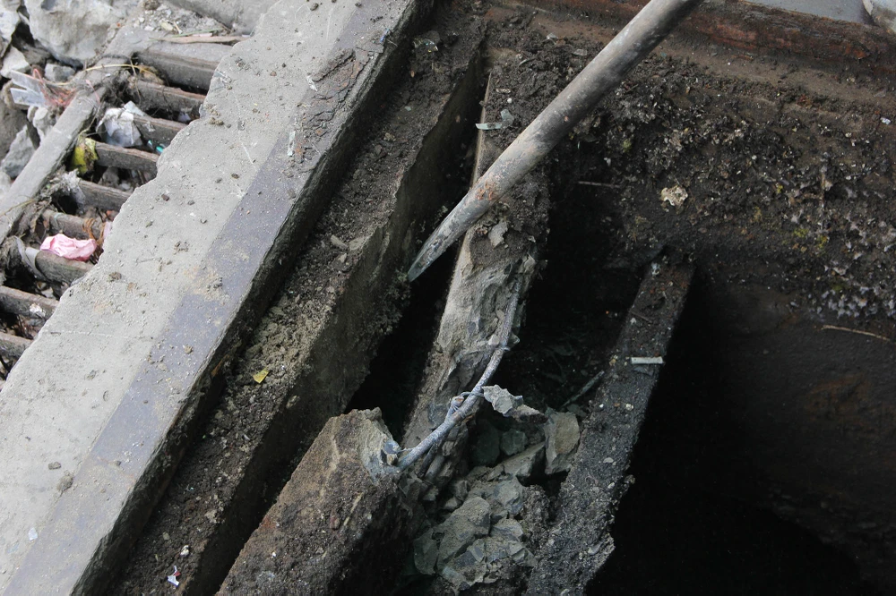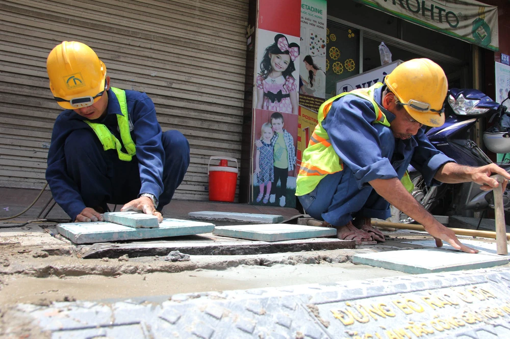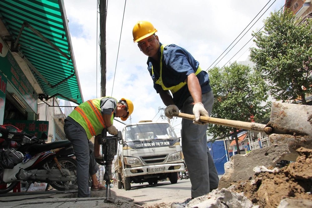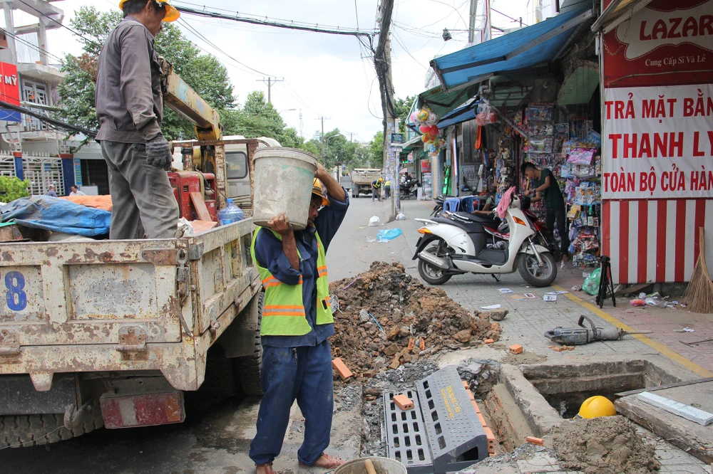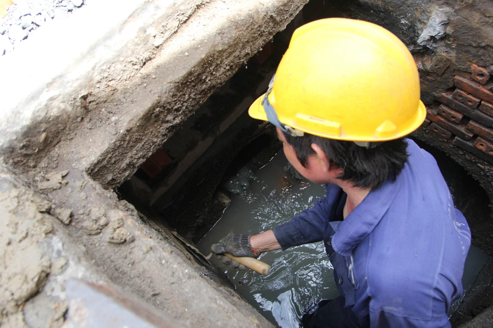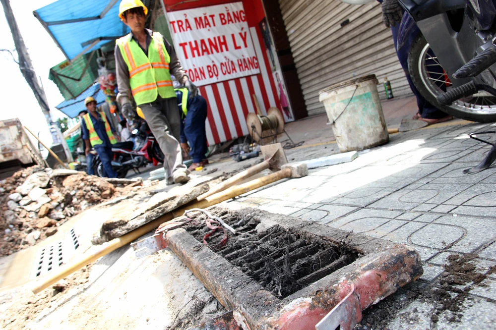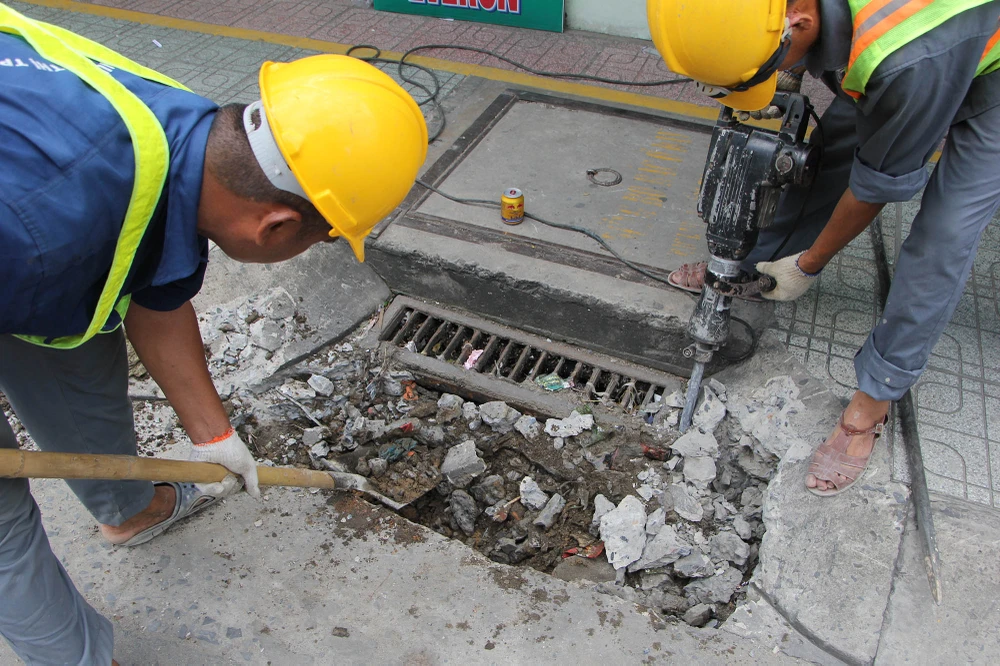 Công nhân công ty môi trường đô thị đang phá bỏ hệ thống hố ga cũ để lắp đặt mới.