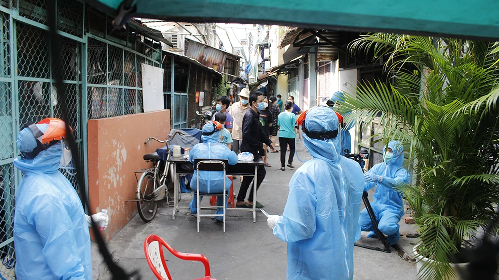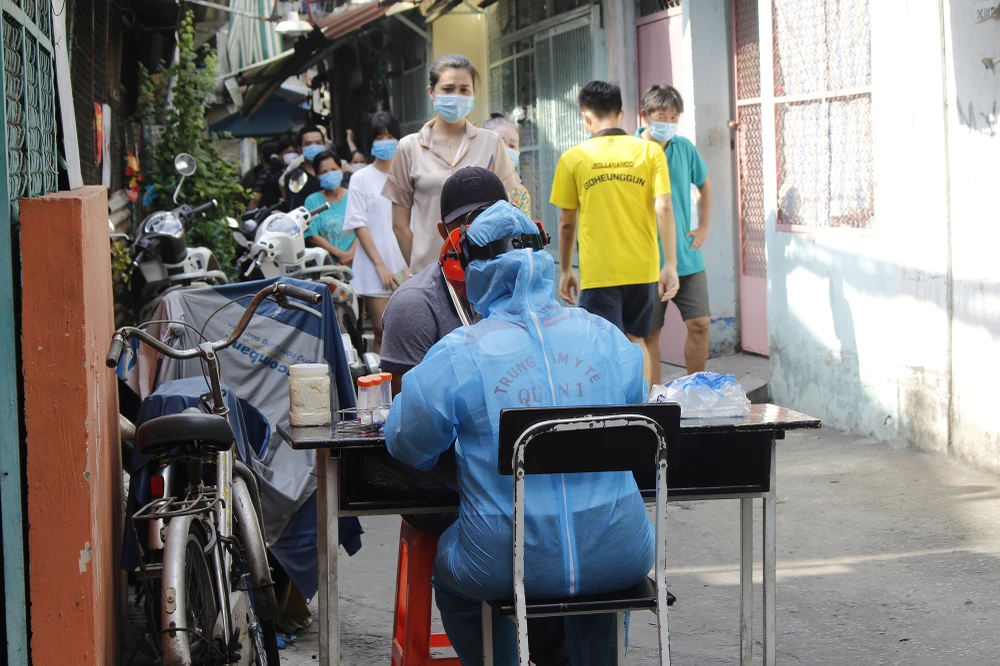Trong chiều 31-5, Trung tâm Y tế quận 1 đã phối hợp với Trung tâm Kiểm soát bệnh tật TP.HCM (HCDC) tiến hành lấy mẫu xét nghiệm cho người dân sống tại hẻm 245 Nguyễn Trãi thuộc khu Mả Lạng, phường Nguyễn Cư Trinh.
