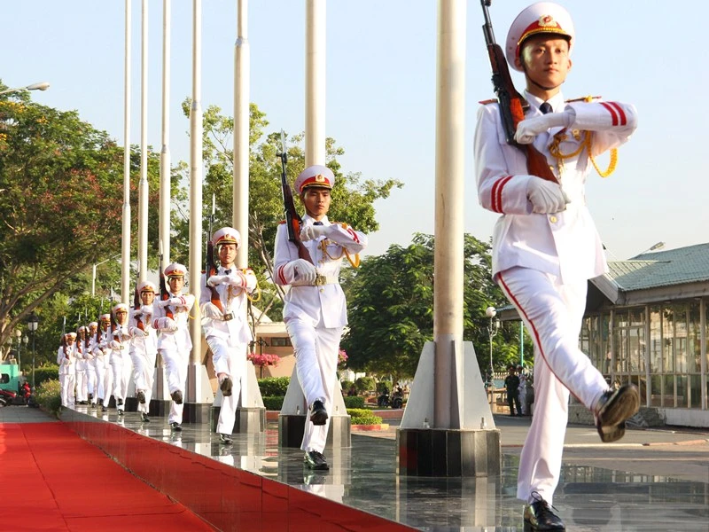 Đội tiêu binh thực hiện nghi thức thượng cờ ASEAN tại cụm cờ Nguyễn Huệ, Bến Bạch Đằng, TP.HCM , sáng 31-12. Ảnh: HOÀNG GIANG