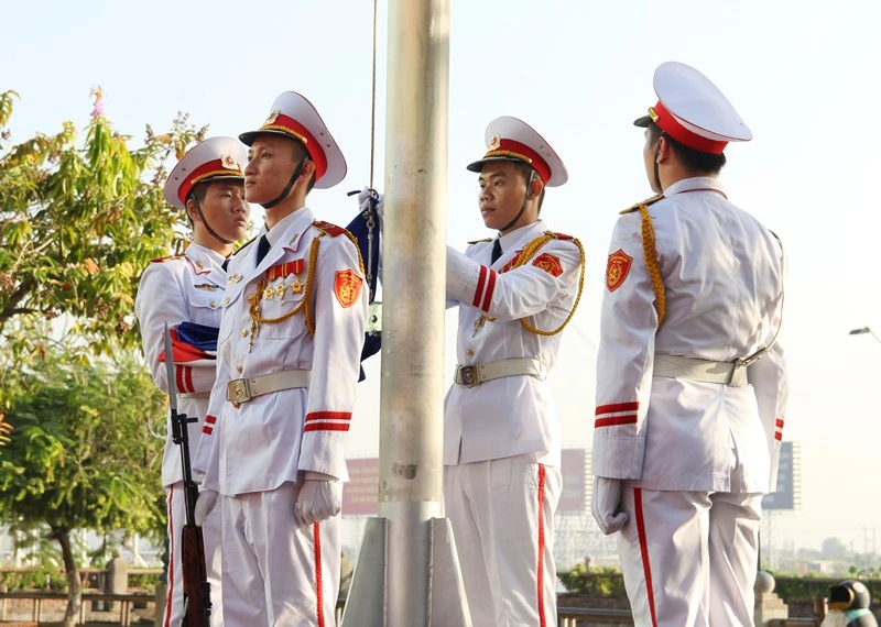 Đội tiêu binh thực hiện nghi thức thượng cờ ASEAN chào mừng cộng đồng ASEAN chính thức được thành lập tại cụm cờ Nguyễn Huệ, Bến Bạch Đằng, TP.HCM , sáng 31-12. Ảnh: HOÀNG GIANG
