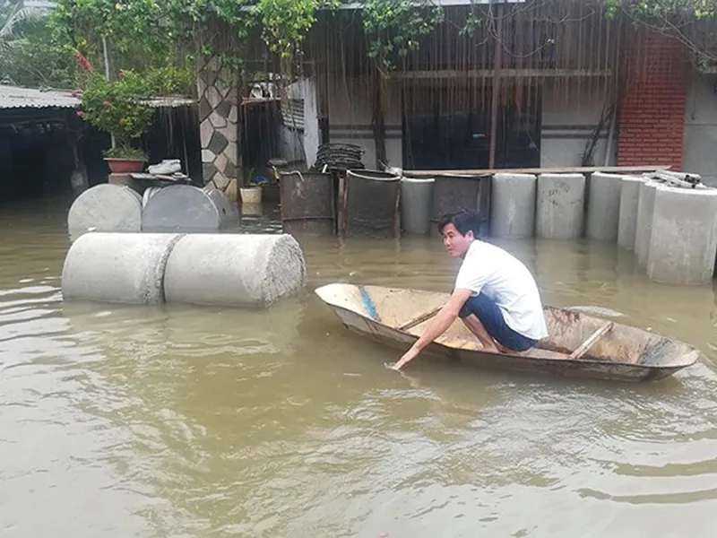 Nhiều hộ dân khác ở đây cũng rơi vào cảnh nhìn nước ngập mai, bonsai nhà cửa. Có người dân ở phường này dùng xuồng đi lại.