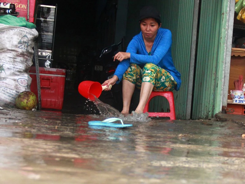 Ở đường số 7, phường Hiệp Bình Chánh (quận Thủ Đức), đến chiều tối 26-11 vẫn còn ngập nặng. Từ tối 25-11, trong trận mưa liên tục, con đường này lênh láng nước. “Nước chảy xối xả vào nhà, không tài nào ngăn lại được. Có làm tấm ngăn chặn ở cửa thì cũng không ăn thua gì, nó cứ tràn vào, tát mỏi cả hai tay mà không hết” - chị Tám, một người dân sống ở khu này cho hay.