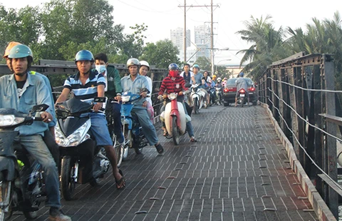 Cầu Rạch Đỉa 1 trên đường Lê Văn Lương, nối quận 7 với huyện Nhà Bè là cầu yếu nhưng có lượng người qua lại rất đông. Ảnh: LĐ