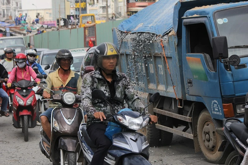 Các xe tải thi công chạy làm đá từ trên xe rơi vãi trên đường.