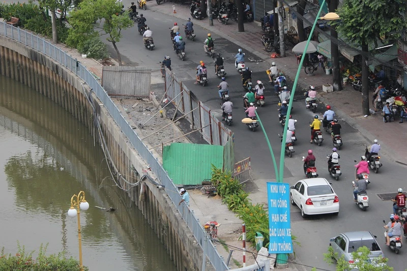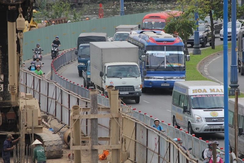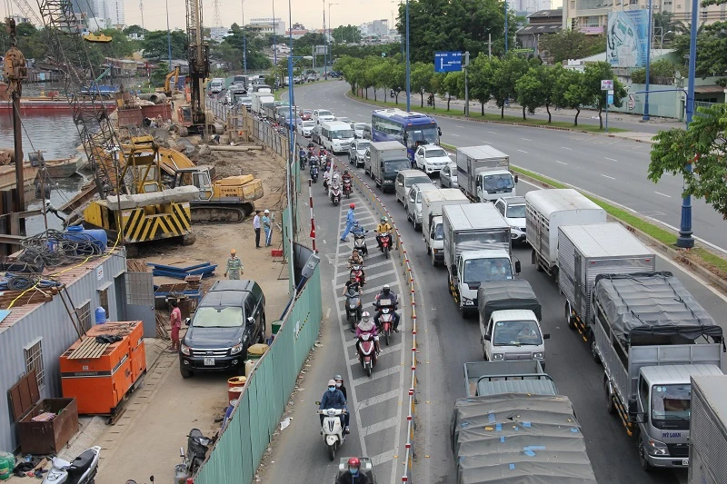 Công trình xây dựng cầu nối đường Võ Văn Kiệt với cầu Nguyễn Văn Cừ (quận 1) đang được rào chắn, giao thông qua đây đông thường xảy ra ùn ứ.