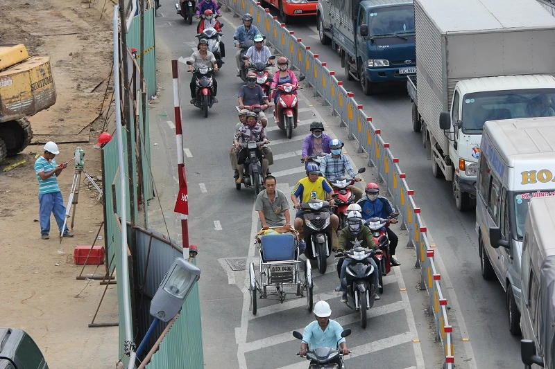 Đoạn rào chắn dài hơn 500 m khiến làn xe máy còn rất ít, giờ cao điểm nhiều xe máy chạy len lỏi ra giữa làn đường ô tô, rất nguy hiểm.