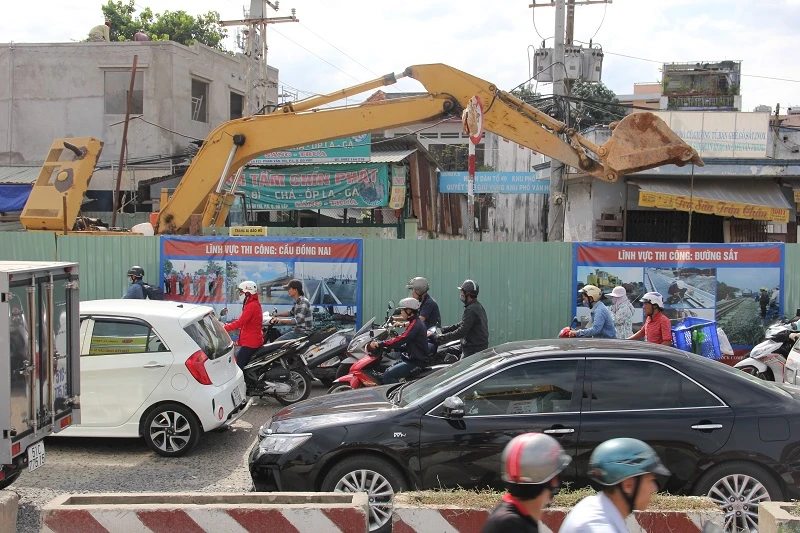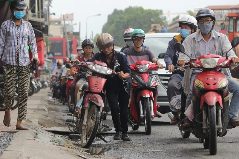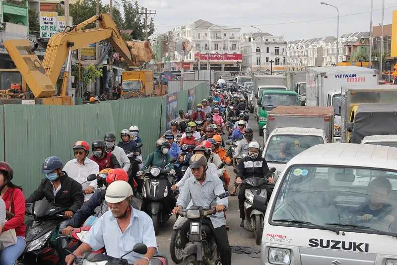 Đoạn đường rào chắn thi công luôn đông các phương tiện qua lại.