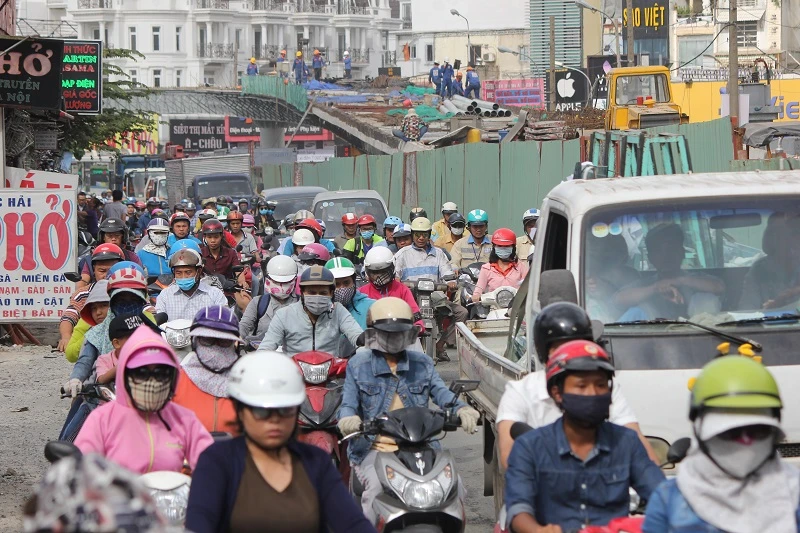 Xe cộ xếp hàng dài trên đường Phan Văn Trị, đoạn cầu Hang Trong, quận Gò Vấp do rào chắn công trình đang thi công.