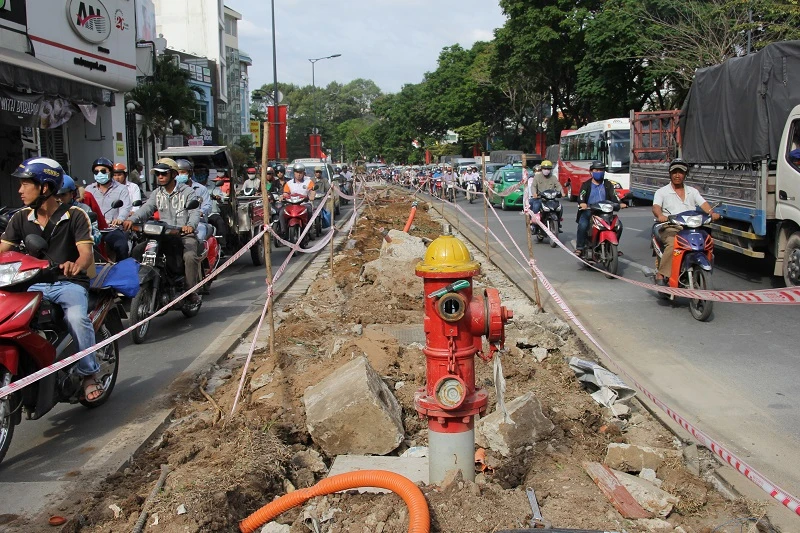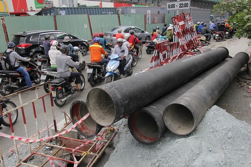 Vật dụng thi công nằm ngổn ngang trên đường Nguyễn Kiệm (quận Gò Vấp).