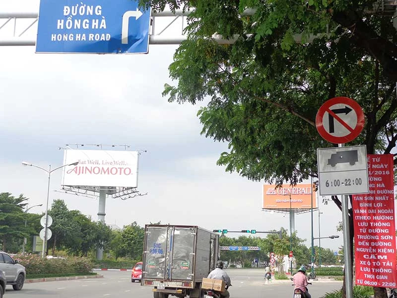 Trên các tuyến đường Trường Sơn, Võ Văn Kiệt, nhiều bảng cấm xe tải cắm theo quy chuẩn mới gây tranh cãi và bối rối cho cơ quan quản lý, kiểm soát giao thông. Ảnh: LĐ