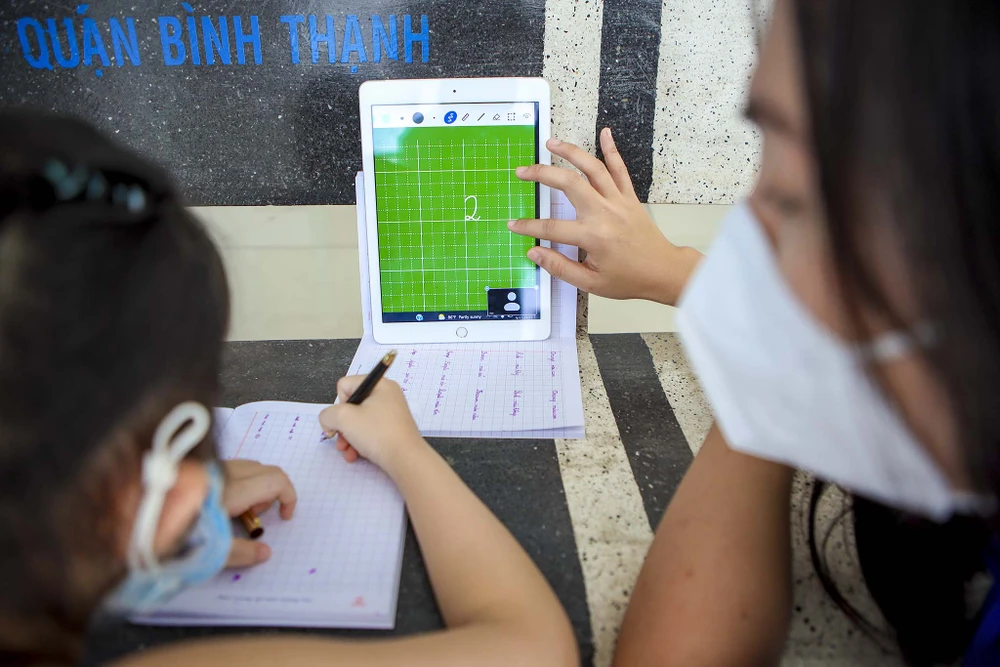 Tình nguyện viên hướng dẫn một em học sinh lớp 2 viết chữ cái, viết số...