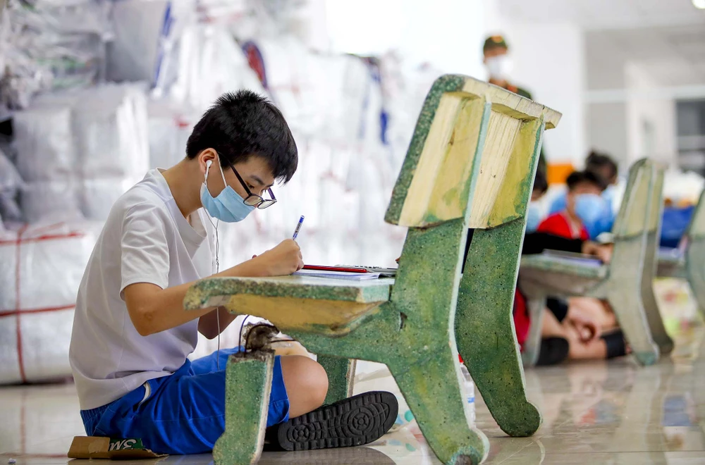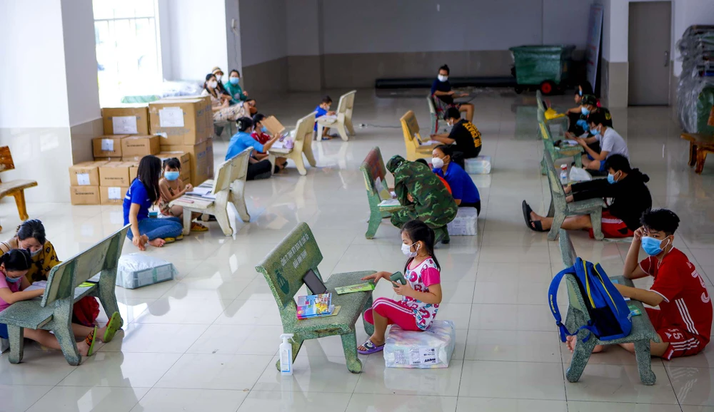 Các hộ khi được tạm di dời đến đây không có điều kiện lắp đặt internet hoặc mua các gói cước 3G, 4G tốc độ cao cho con học trực tuyến nên Tổ phụ trách ở chung cư đã tận dụng sảnh block A để làm một lớp học dã chiến. Những chiếc ghế đá trở thành bàn học cho các em, chúng được xếp ngay ngắn, giãn cách với nhau.