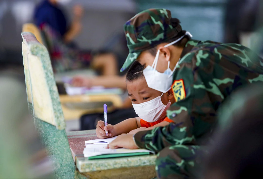 "Từ khi năm học mới bắt đầu, ngoài những công việc được giao như đi chợ hộ, phát túi an sinh, chúng tôi cũng tham gia hỗ trợ, giúp đỡ các em học sinh học online tại lớp học dã chiến. Theo đó, do lớp học hạn chế người, nên chúng tôi sẽ thay phụ huynh kiểm tra, theo dõi các em học sinh trong quá trình học tập. Chúng tôi có thể hỗ trợ các em giải Toán, học Tiếng Việt, Tiếng Anh...", Nguyễn Hoài Nam (Học viên Trường Sĩ quan Lục quân 2) cho biết.