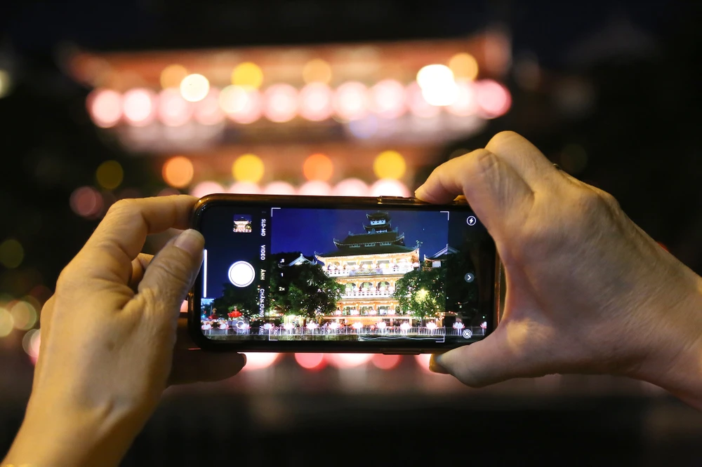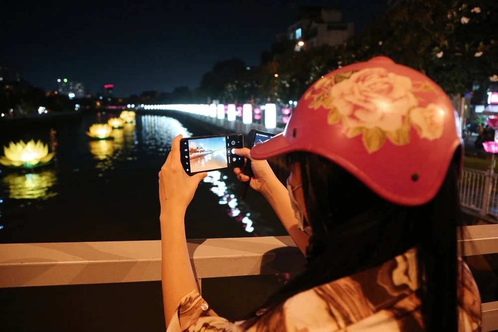 Nhiều người đi đường nán lại để chụp khung cảnh chùa Pháp Hoa lung linh mừng Phật đản.