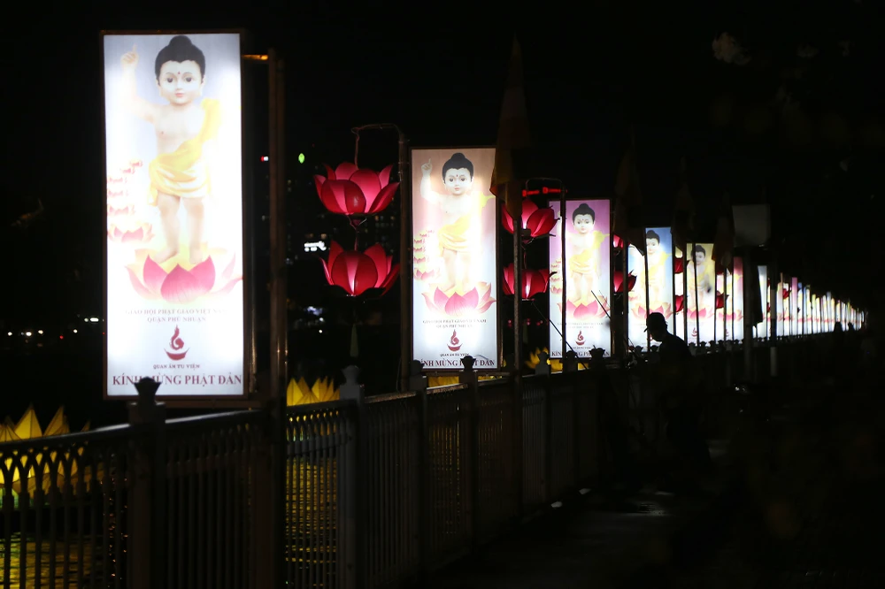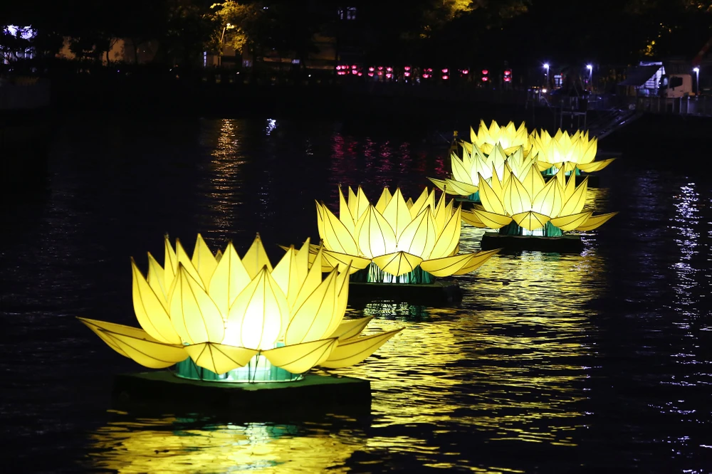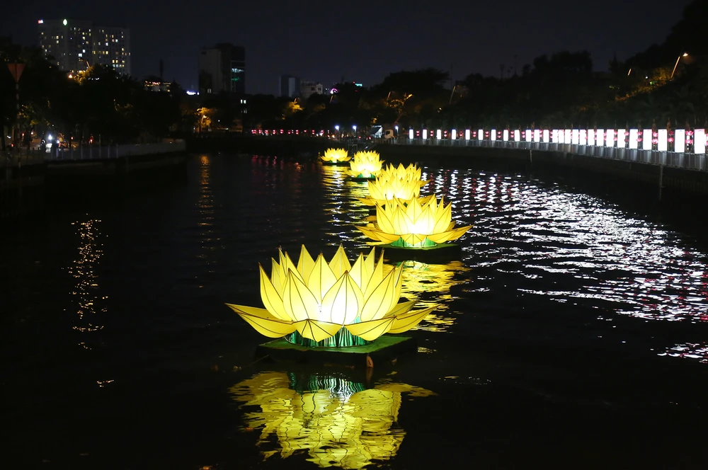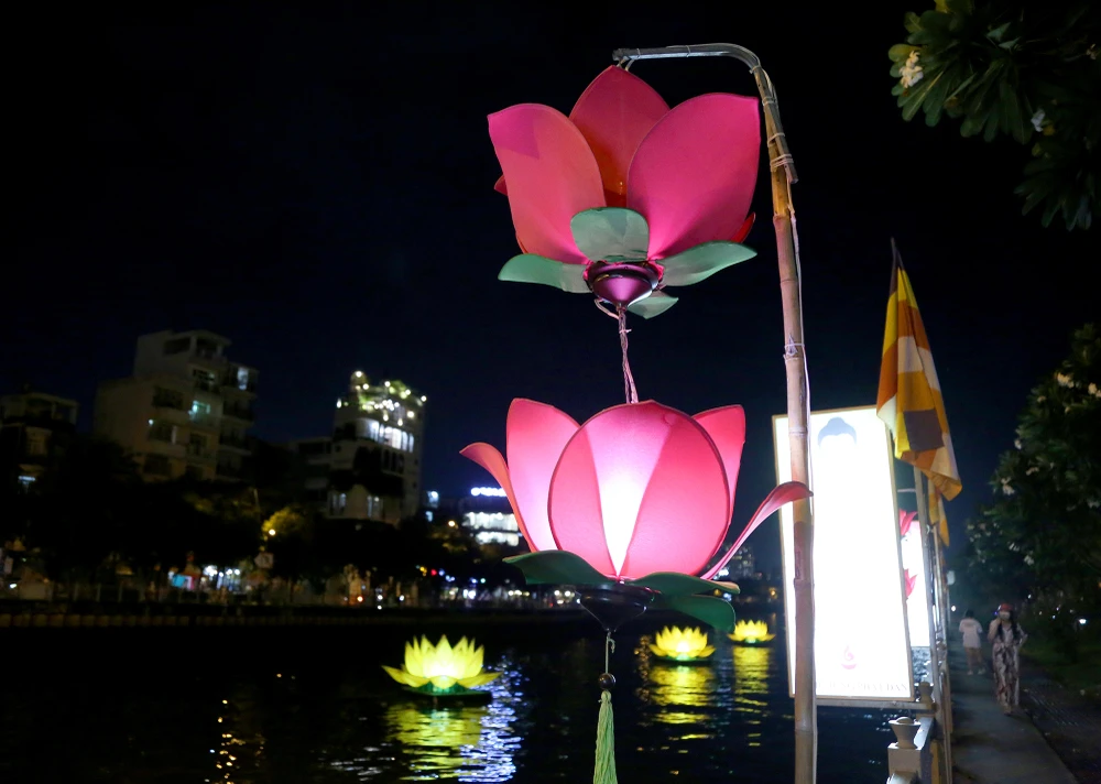 Như thông lệ hằng năm, để chào mừng Đại lễ Phật đản, chùa Quan Âm Tu Viện (Q.Phú Nhuận) cho hạ thủy 7 đài hoa sen khổng lồ rực sáng cả một khúc kênh.