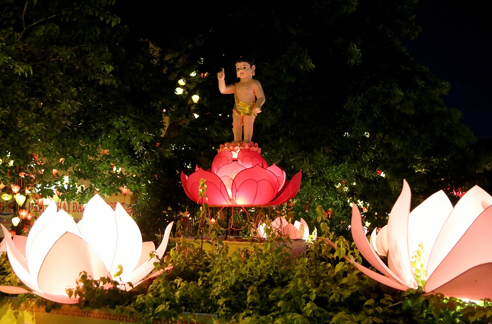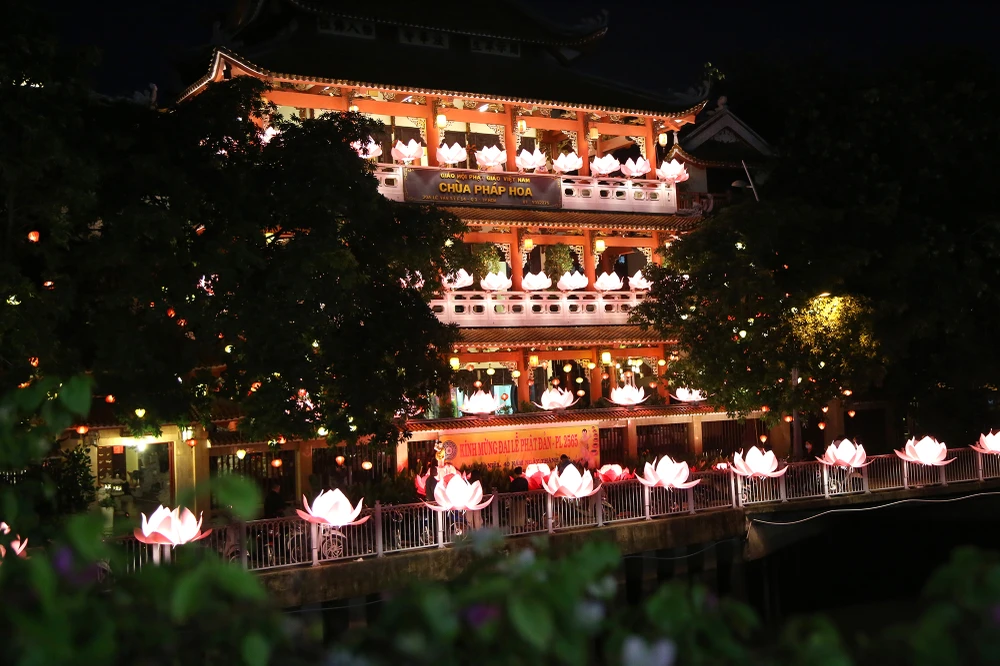 Gần đó, chùa Pháp Hoa (quận 3) cũng sáng rực từ việc trang trí các bông hoa sen phát sáng.