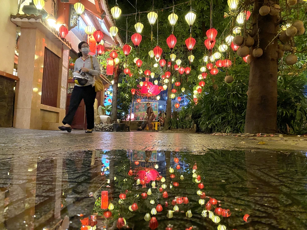Những chiếc lồng đèn nhỏ phát sáng trong đêm được treo dọc bờ kênh.