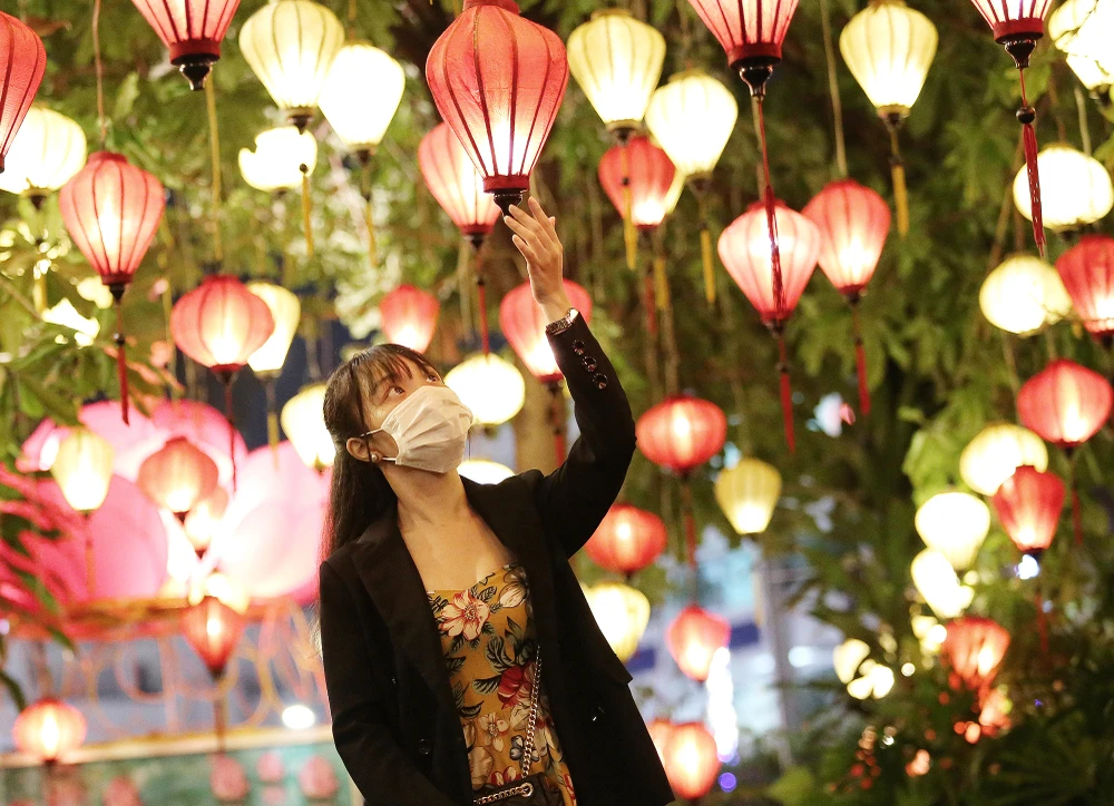 Do ảnh hưởng của dịch COVID-19, vào đúng ngày chính lễ Phật đản, chùa Pháp Hoa không làm lễ mà cho các Phật tử tự do đến viếng Phật, lễ Phật. Trong ảnh: Bạn trẻ chụp ảnh với những chiếc lồng đèn trang trí trong khuôn viên chùa Pháp Hoa.