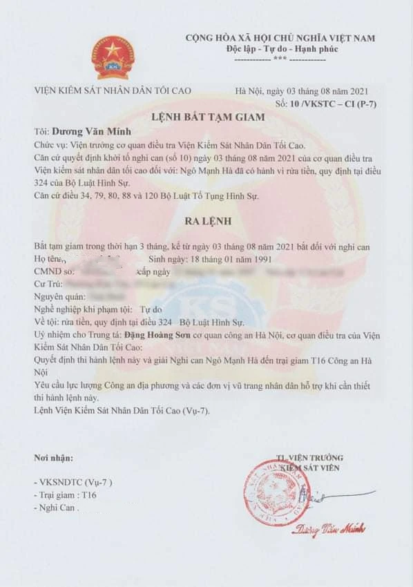 Lệnh bắt tạm giam. Ảnh: NVCC