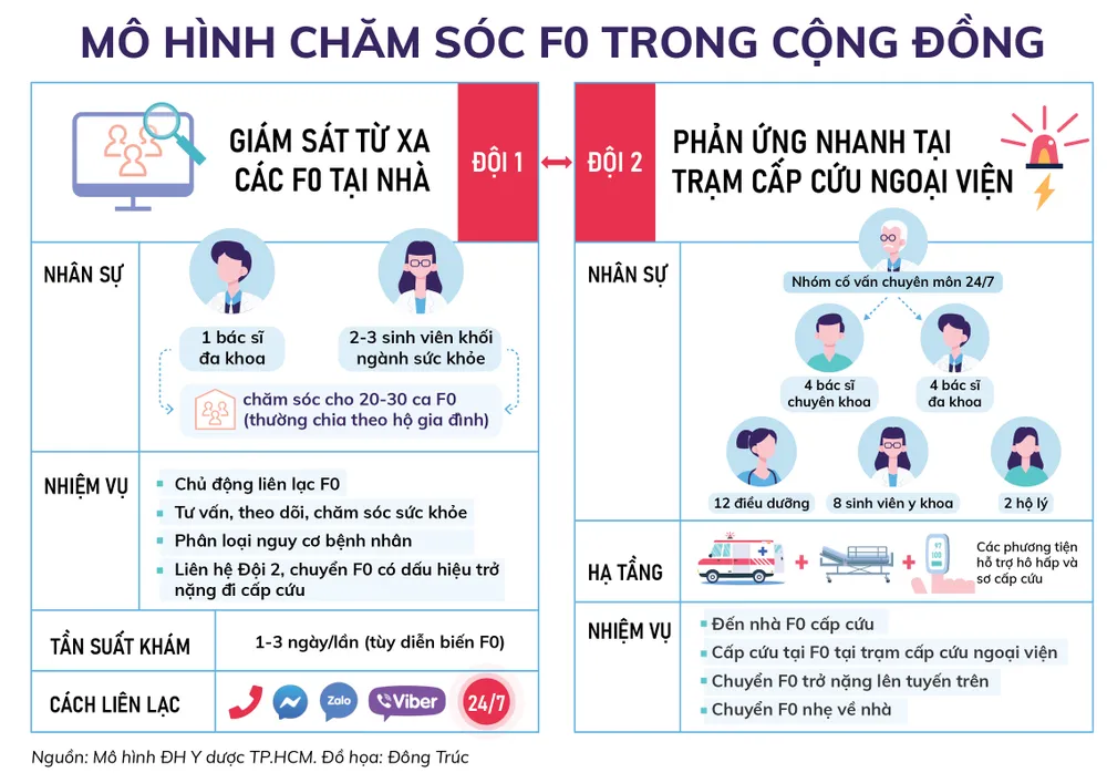 Đội 1: Giám sát từ xa các F0 tại nhà. Chúng tôi tổ chức thành nhiều nhóm, mỗi nhóm gồm một bác sĩ (BS) đa khoa, 2-3 sinh viên khối ngành sức khỏe. Mỗi nhóm sẽ chăm sóc cho 20-30 ca F0 (thường chia theo hộ gia đình). Điểm đặc biệt của đội 1 trong mô hình của chúng tôi là chăm sóc sức khỏe theo cách cá thể hóa như là các BS gia đình.