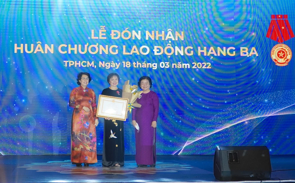 Nguyên Phó Chủ tịch nước Trương Mỹ Hoa (phải) và Chủ tịch UBMTTQVN TP (trái) trao huân chương lao động hạng 3 cho bà Cao Thị Ngọc Dung. Ảnh: N.N