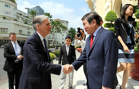 Chủ tịch UBND TP.HCM Nguyễn Thành Phong thân mật đón tiếp Bộ trưởng Ngoại giao Liên hiệp Vương quốc Anh và Bắc Ireland Philip Hammond. Ảnh: THANH VŨ