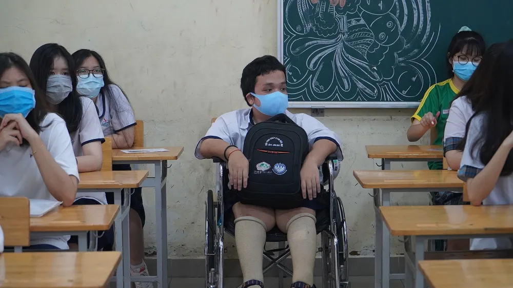 Một trường hợp khác cũng khá đặc biệt tại điểm thi THPT Phan Đăng Lưu, em Nguyễn Văn Tâm bị khiếm khuyết phải ngồi xe lăn. Được biết, Tâm mồ côi ba mẹ từ nhỏ, hiện đang sống tại Trung tâm nuôi dưỡng bảo trợ trẻ em quận Gò Vấp.