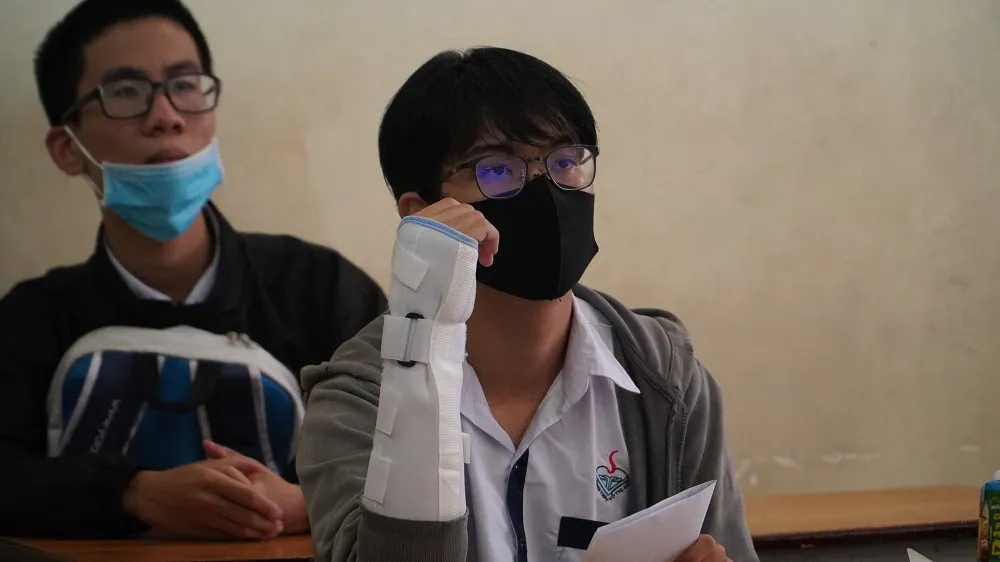 "Lúc đầu em cũng dự định dời sang năm sau thì nhưng cô chủ nhiệm em khuyên nếu dời năm sau thì em phải thi lại với thí sinh tự do. Em cũng không muốn lãng phí thêm một năm nữa nên quyết định đến ngày thi em sẽ bọc cái nẹp đi thi luôn", Quân bộc bạch.