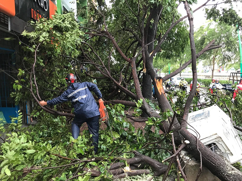 Chiều 10-8, trong mưa gió lớn một cây xanh trên đường Trường Sa (phường 12, quận 3) bất ngờ bị gãy ngang.