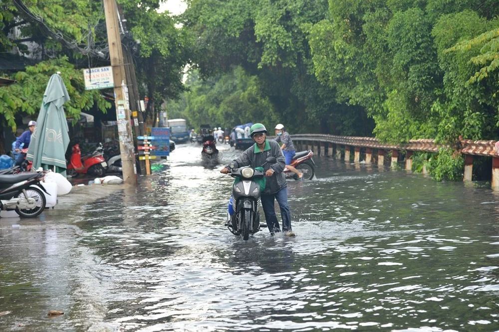 Do ở vùng trũng thấp, nước tràn từ các kênh, cống lên đường khiến nhiều phương tiện chết máy, người dân phải dắt bộ.