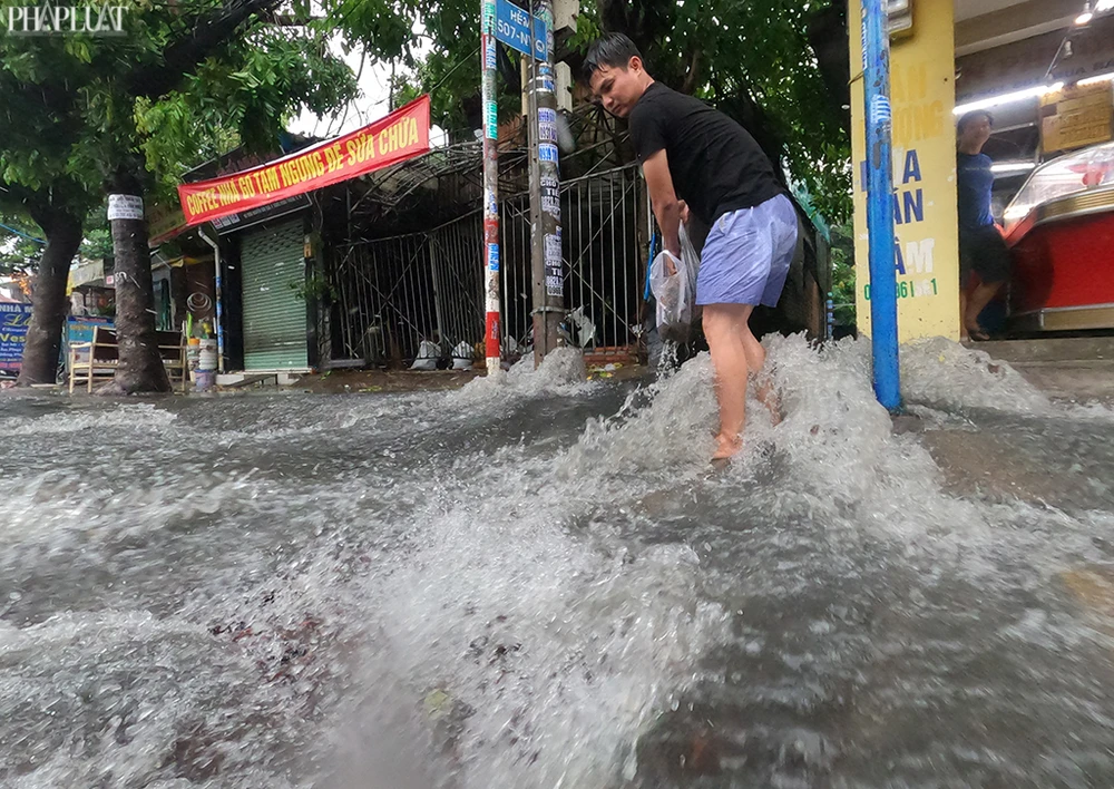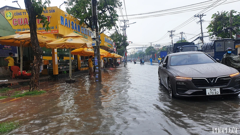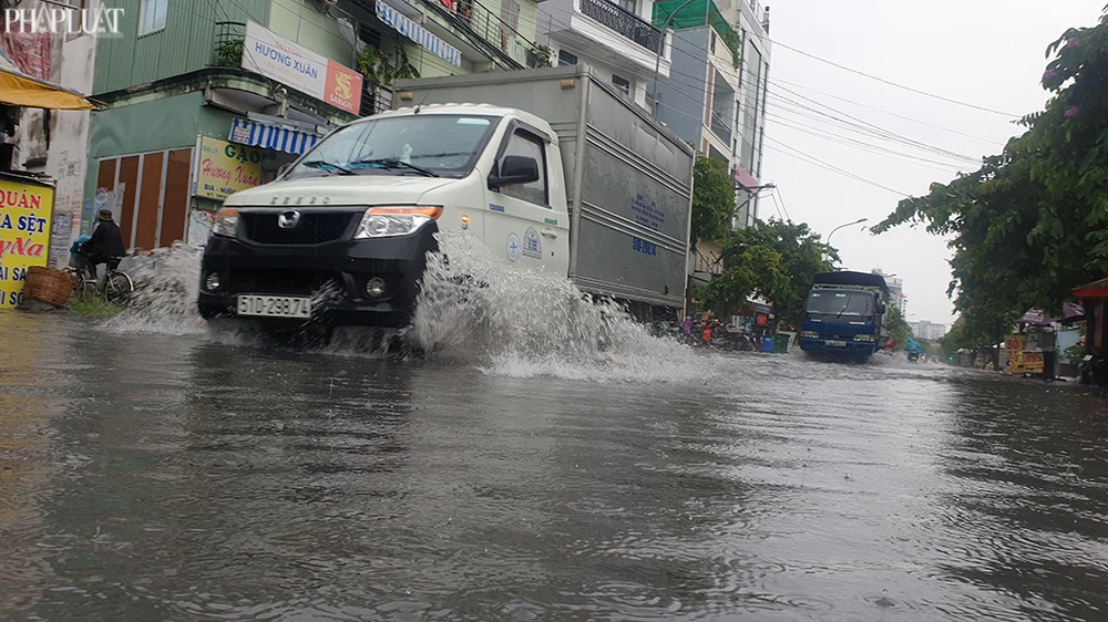 Đường Phan Văn Hớn (quận 12) cũng rơi vào tình trạng ngập cục bộ một số đoạn ngắn. Ảnh NT