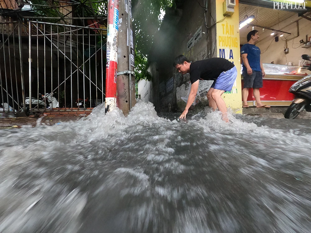 Trên đường Nguyễn Văn Quá (quận 12), dù mới được đầu tư hệ thống cống thoát nước hiện đại nhưng một số điểm vẫn ngập cục bộ. Nước cống ở các khu vực tràn vào nhà dân, chảy như thác. Ảnh NT