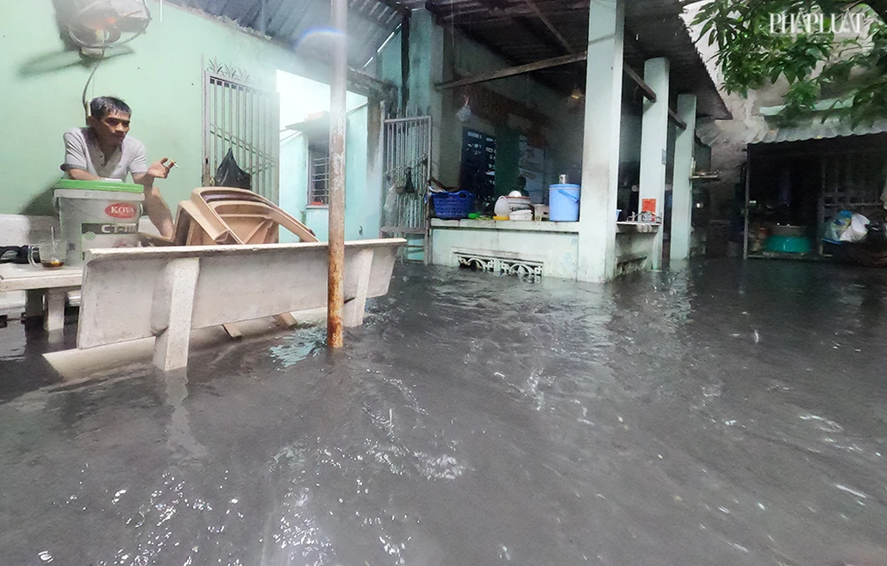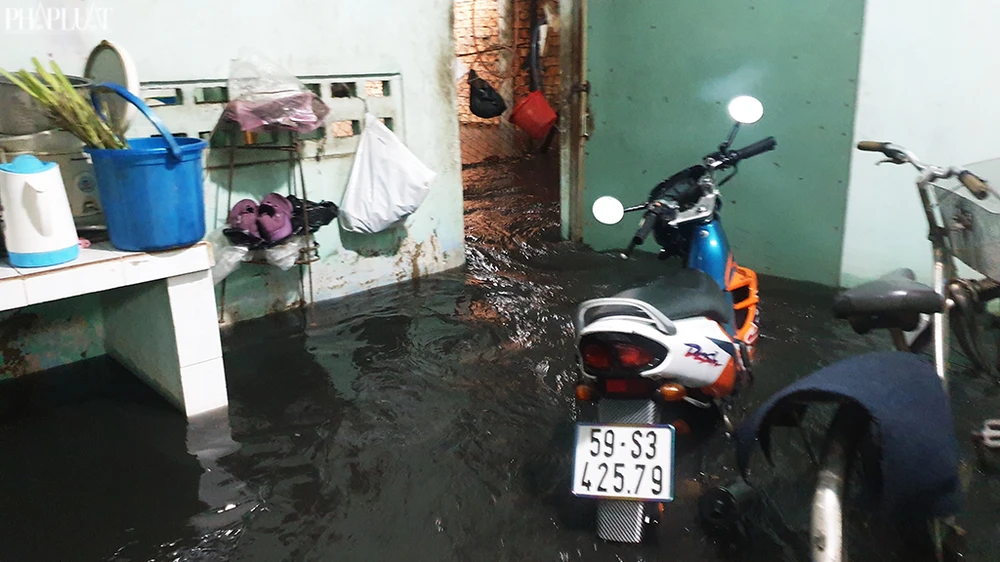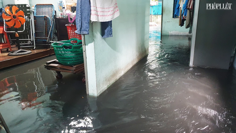 Tại căn nhà trong con hẻm đường Nguyễn Văn Quá (phường Đông Hưng Thuận) nước cống tràn vào, có chỗ sâu hơn nửa mét, bốc mùi khó chịu. Ảnh NT