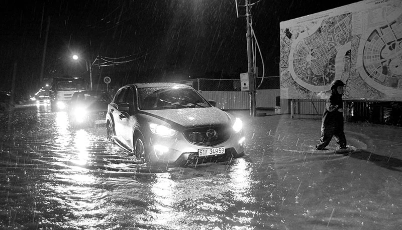 Xe ô tô chết máy giữa dòng nước trên đường Lương Định Của.