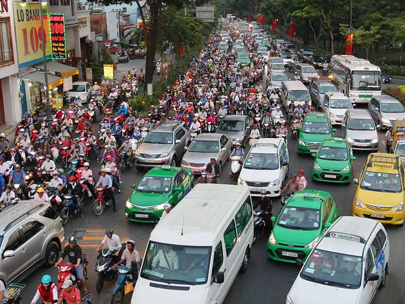 Giao thông ùn ứ tại nhiều tuyến đường quanh sân bay Tân Sơn Nhất vào giờ cao điểm. Ảnh: HOÀNG GIANG