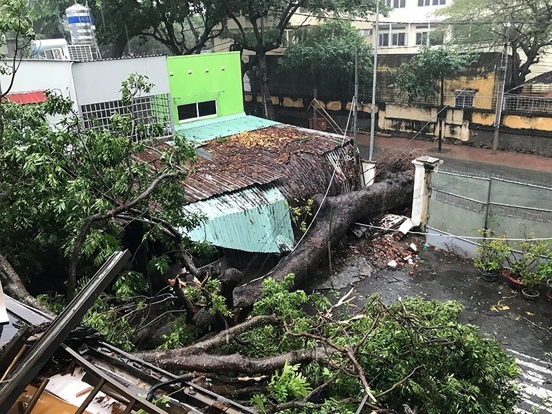 Cây ngã ra đường làm sập nhà dân, hỏng trụ sở một công ty ở Vũng Tàu. Ảnh: HOÀNG GIANG