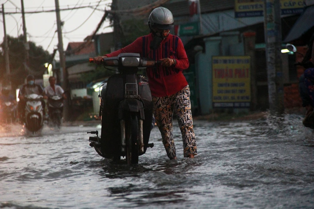 Chiều tối 23-12, triều cường dâng cao kết hợp với một cơn mưa lớn kéo dài khoảng 30 phút khiến tuyến đường Lê Văn Lương, phường Nhơn Đức (huyện Nhà Bè, TP.HCM) ngập sâu chiều cuối tuần.