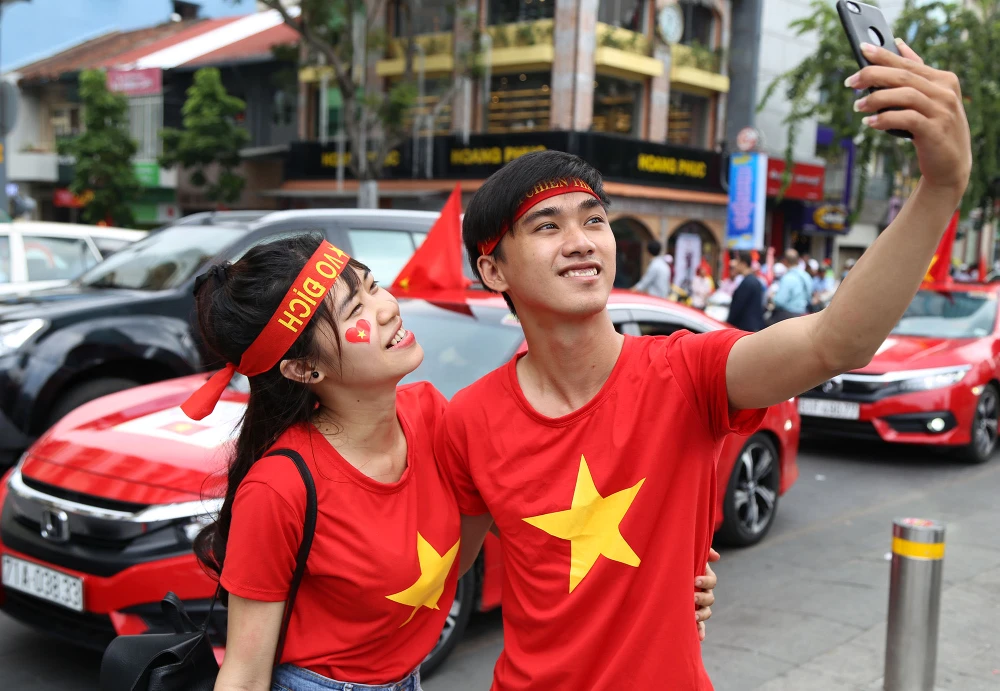 Những cặp đôi tranh thủ xuống phố vì tình yêu với đội tuyển.
