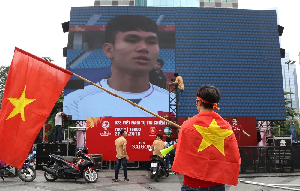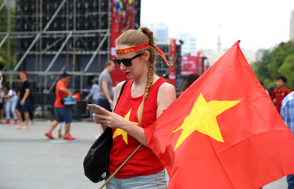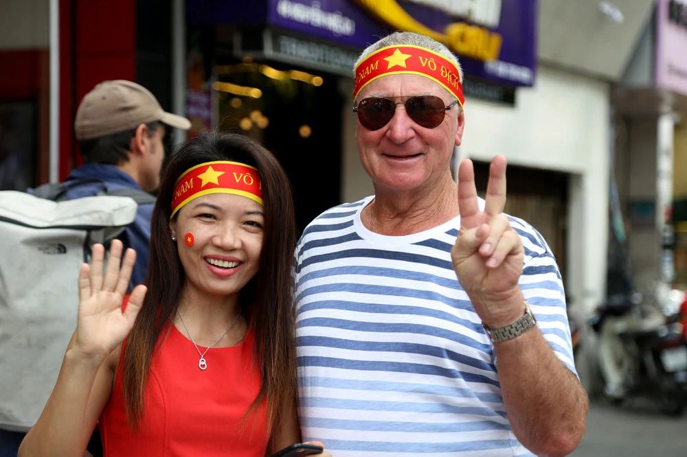 Khách nước ngoài cũng hào hứng hòa vào dòng người cổ vũ U-23 Việt Nam.