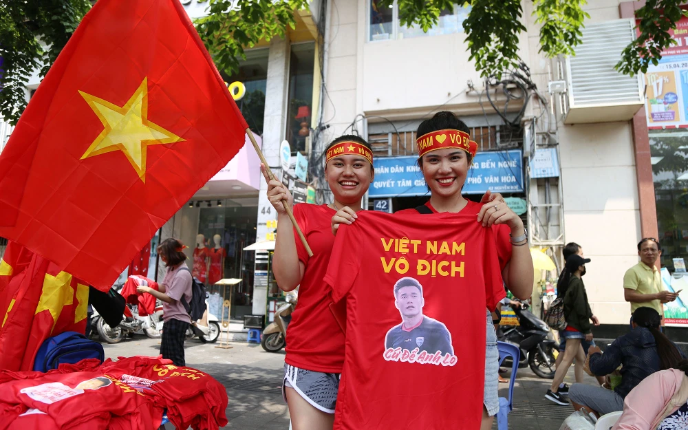 Hai cô gái diện cờ và áo có hình thủ môn Bùi Tiến Dũng xuống phố Nguyễn Huệ.