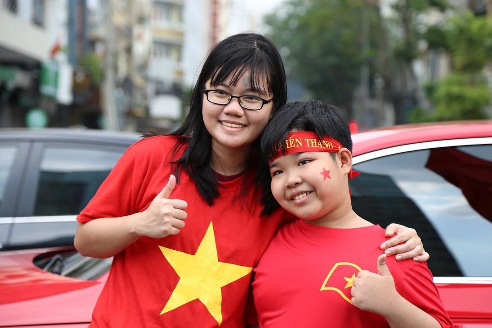 Hai em nhỏ xuống phố cổ vũ đội tuyển.