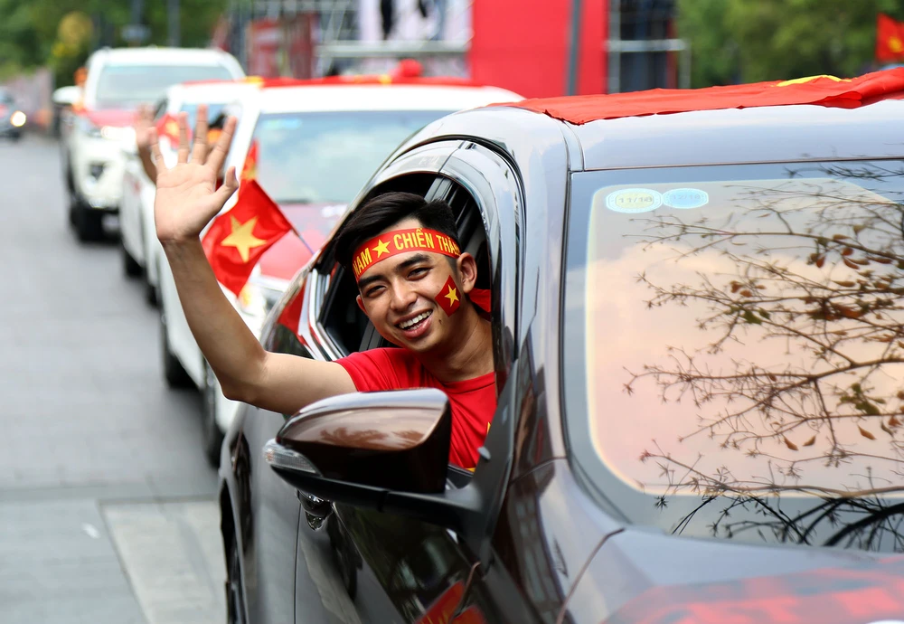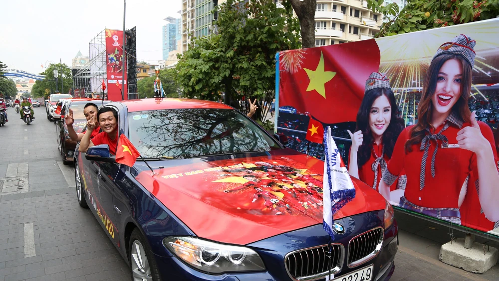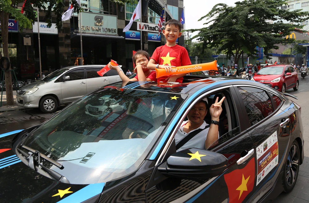 Dàn xe hơi của CĐV Sài Gòn dán cờ và hình ảnh các cầu thủ U-23 Việt Nam xuống đường diễu hành trước trận đấu.