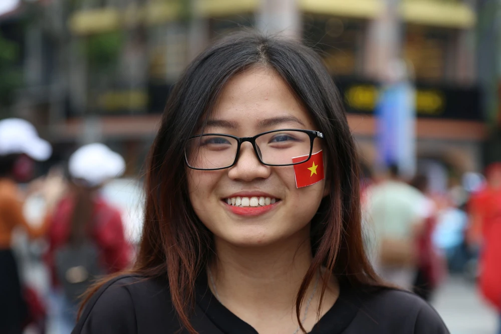 Một cổ động viên nữ tươi tắn với hình dán lá cờ Việt Nam xuống phố.