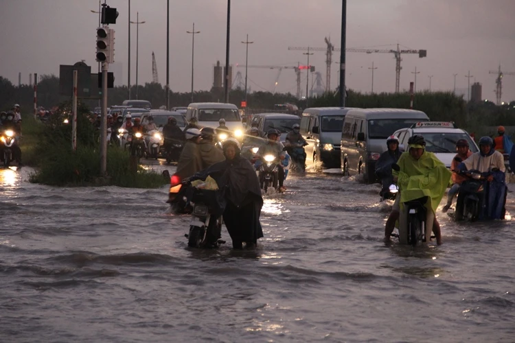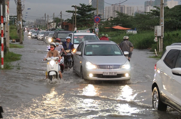 Nước ngập sâu trên đường Lương Định Của, quận 2 khiến xe cộ di chuyển khó khăn