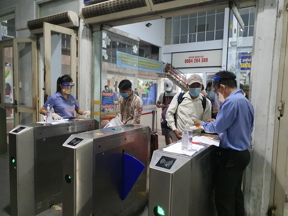Theo quan sát, tại cửa chính của ga Sài Gòn, một hàng dài người dân đang xếp hàng để chờ làm thủ tục. Cũng tại khu vực này, một số người đang kê khai thông tin vào bản cam kết phòng, chống dịch COVID-19 trước khi lên tàu.