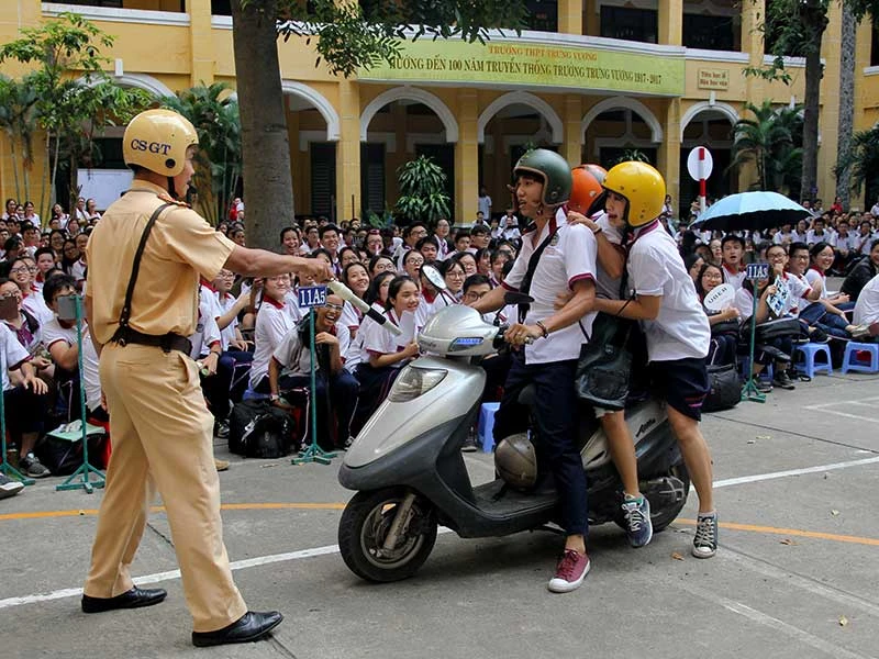 Học sinh Trường THPT Trưng Vương (quận 1, TP.HCM) học Luật Giao thông đường bộ thông qua những tình huống trực tiếp tại sân trường. Ảnh: HOÀNG GIANG